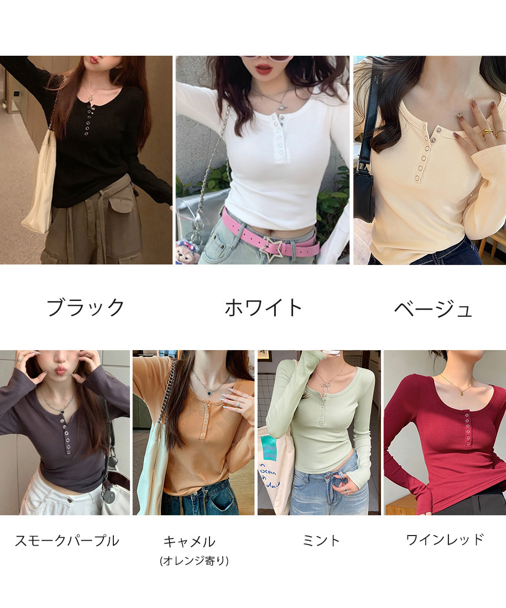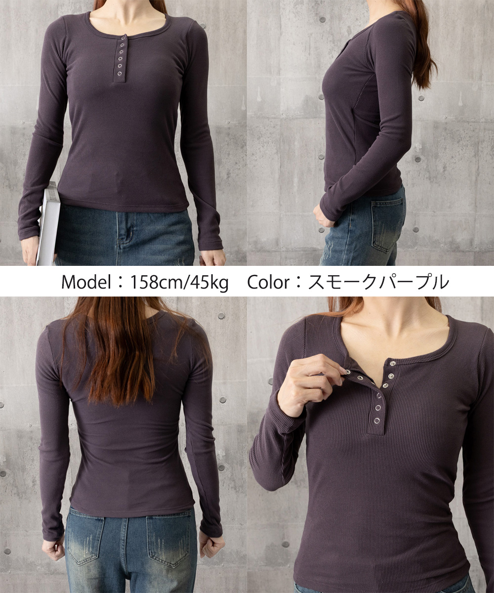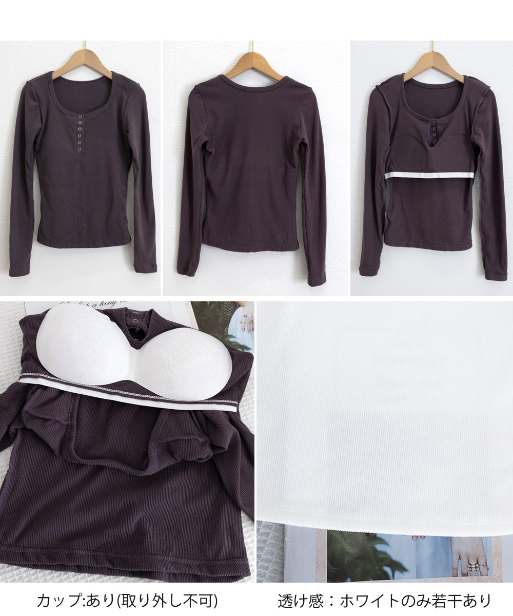 起毛素材で暖かいリブ編み長袖トップス。 カップ付きで下着を気にせず一枚で着用でき、程よくフィットして体型をきれいに見せます。 フロントのボタンがさりげないアクセント。ベージュコーデにもぴったりで、デニムやスカートと合わせて着回し力抜群。 秋冬のインナーや重ね着に活躍する万能トップスです。
