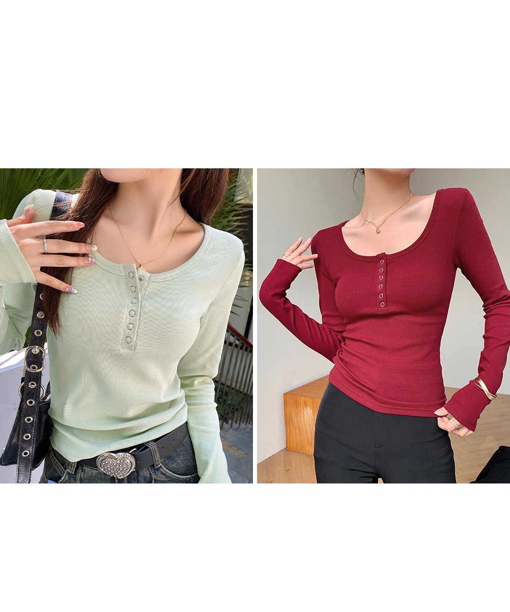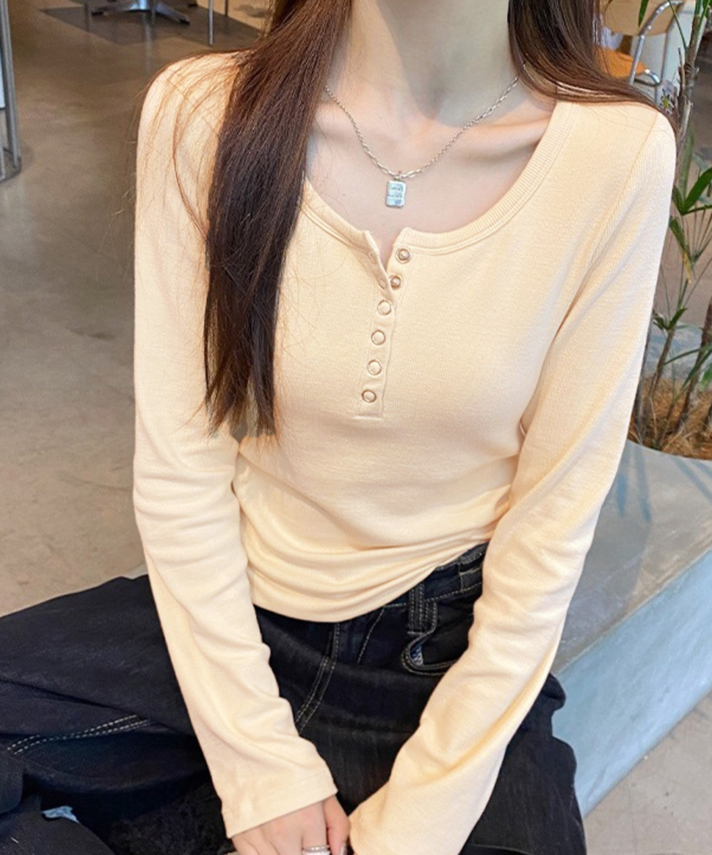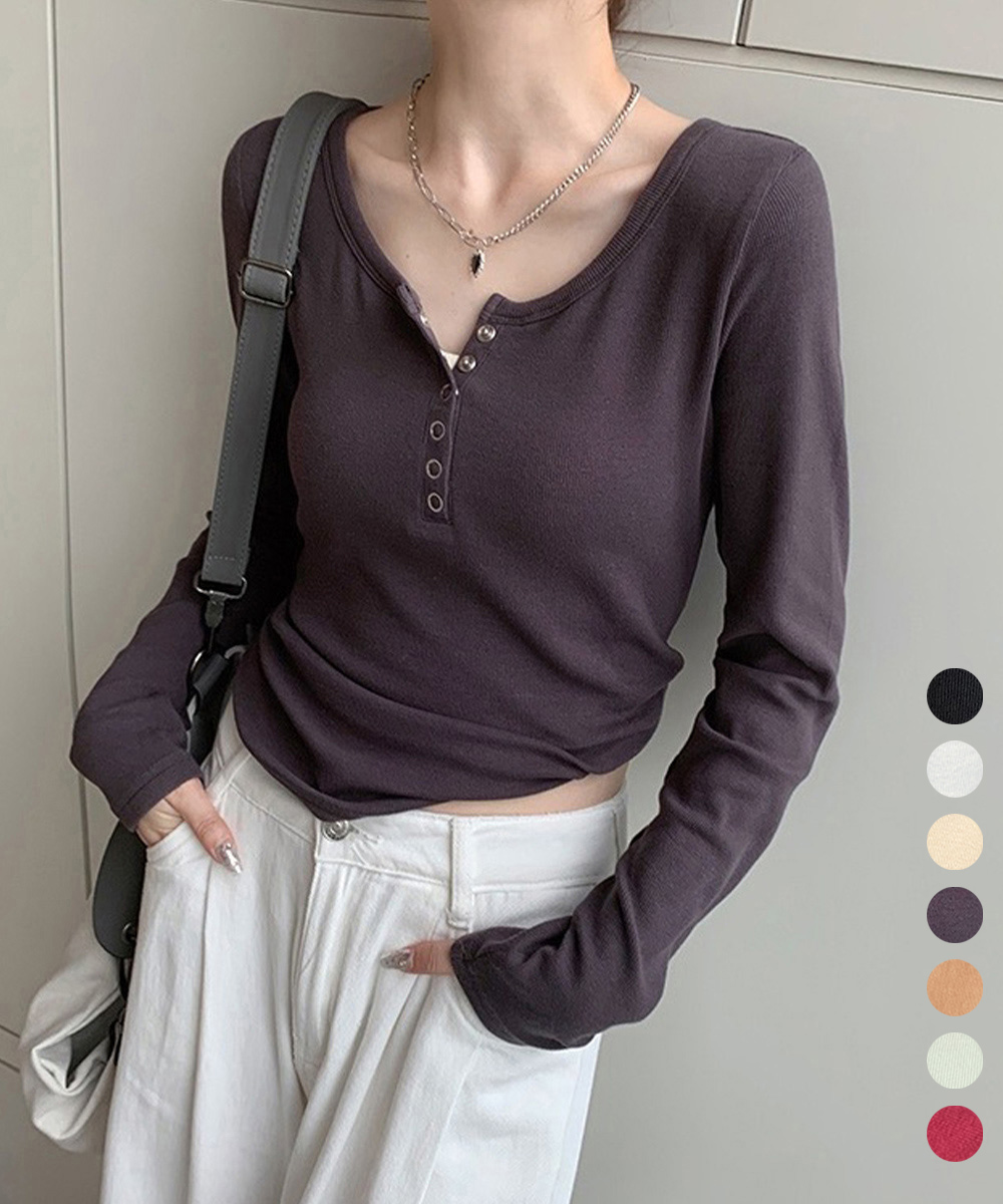 起毛素材で暖かいリブ編み長袖トップス。 カップ付きで下着を気にせず一枚で着用でき、程よくフィットして体型をきれいに見せます。 フロントのボタンがさりげないアクセント。ベージュコーデにもぴったりで、デニムやスカートと合わせて着回し力抜群。 秋冬のインナーや重ね着に活躍する万能トップスです。