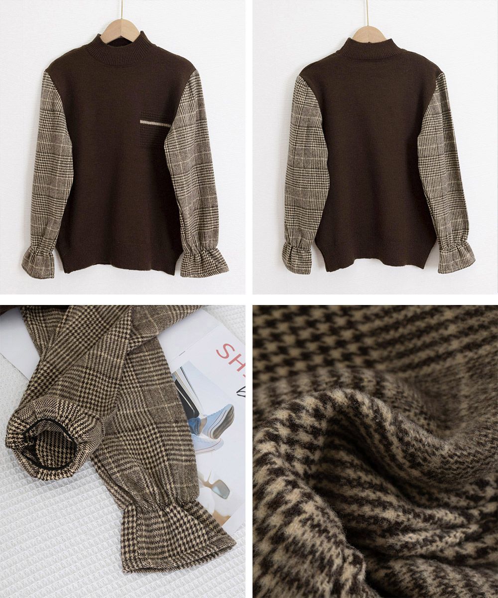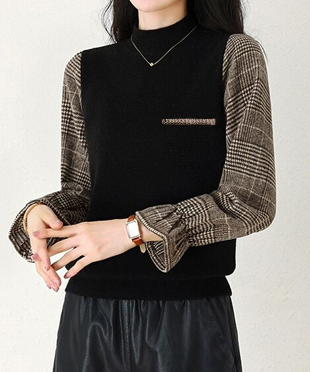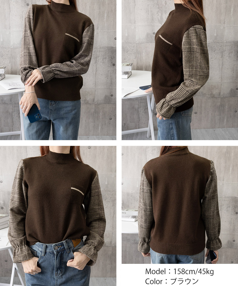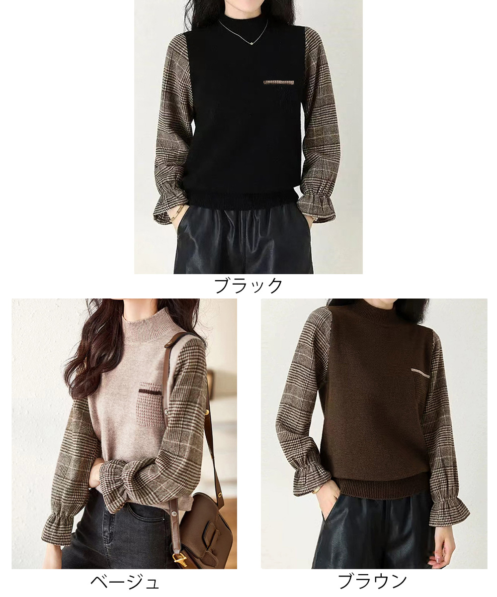 ハイネック 大人カジュアル レイヤード風 ニットトップス 重ね着風ニットプルオーバー袖切り替え 韓国風ニット長袖 着やせ きれいめニット人気 袖異素材ニット秋冬 大人可愛いセーター チェック柄の袖が目を引く、異素材ドッキングのハイネックニットトップス。 柔らかく暖かなニット素材に、シャツ風の袖切り替えがアクセントをプラス。 袖はキャンディースリーブになっており可愛らしいシルエットに。 胸仮ポケットのデザインが可愛らしく、カジュアルながらもおしゃれに決まる。 デニムやロングスカートと合わせて、こなれ感のある秋冬コーデを楽しめる。 本体素材:ポリエステル80%+アクリル20% 別地素材:ポリエステル100% カラー:ブラック/ベージュ/ブラウン サイズ:ワンサイズ 着丈:約57cm 肩幅:約39cm 袖丈:約55cm ゆき:約74.5cm 身幅:約49cm 胸囲:約98-126cm 裏地:なし 伸縮性:身頃のみあり 透け感:なし