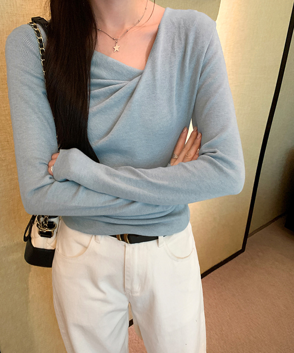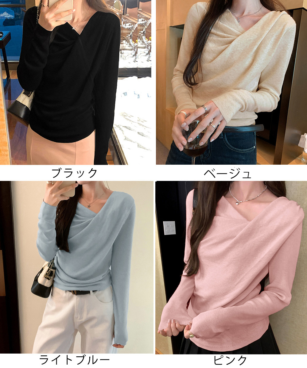 上品なドレープデザインが魅力の長袖ニットトップス。