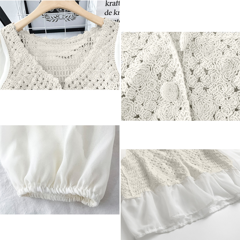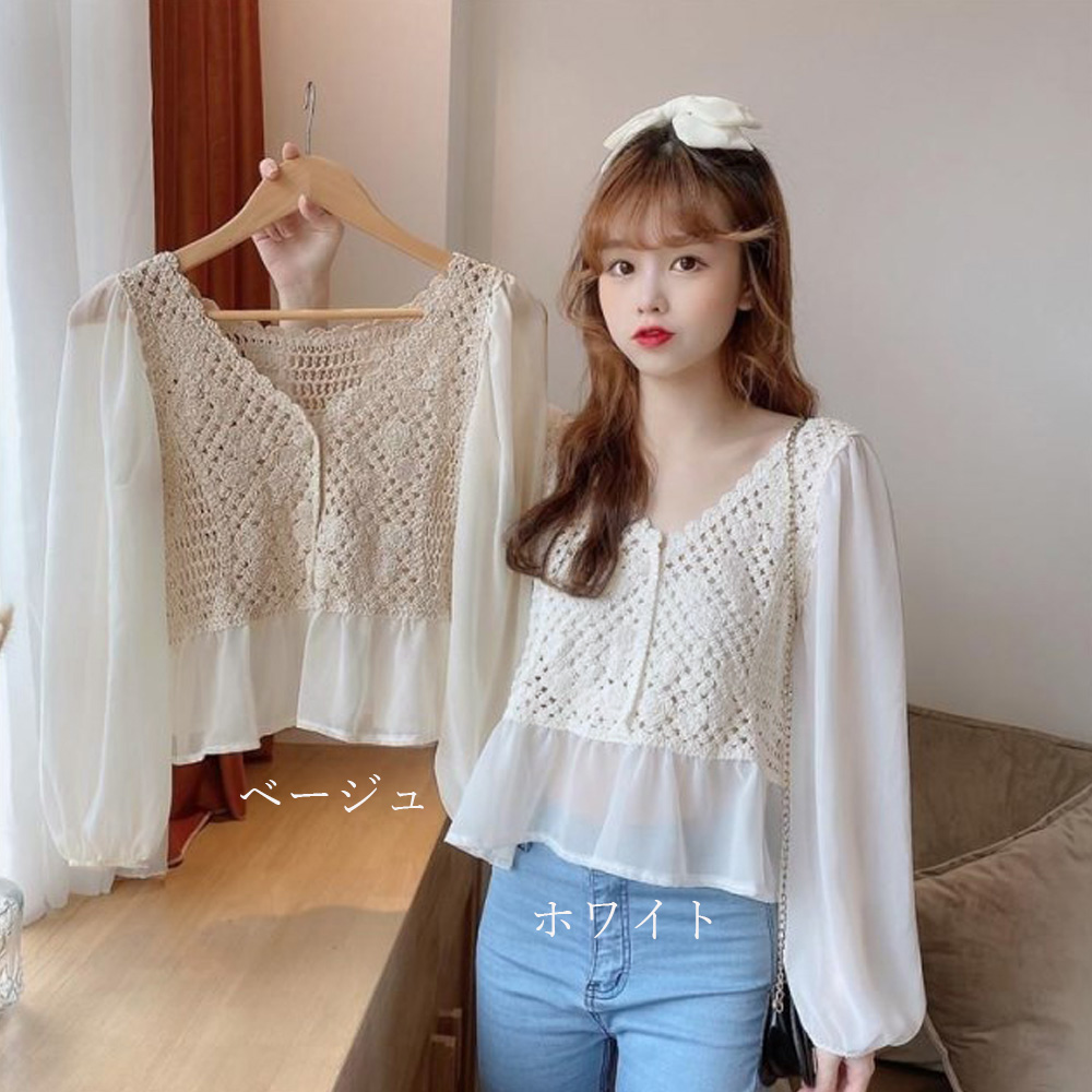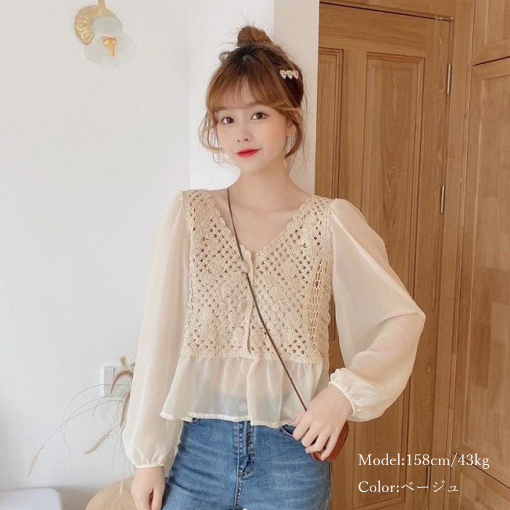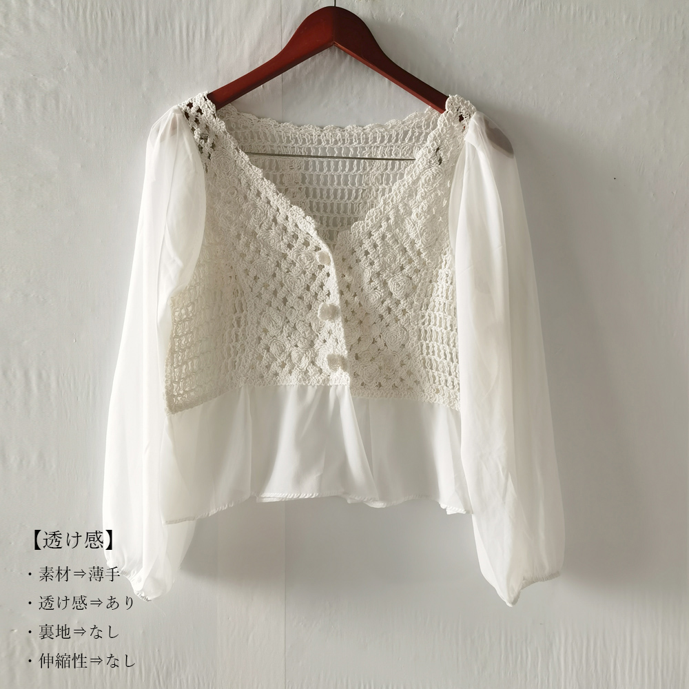 レディース かぎ編み ショート丈トップス パフスリーブ 刺しゅう レトロブラウス エレガント シフォン袖 シャツ 透かし ブラウス 薄手 トップス 袖部分と裾部分に異素材を重ねてエレガントに仕上げたフェミニンなかぎ編み切替ブラウス デコルテラインを美しく見せてくれるVネックは暖かな季節にぴったりの1枚 セレブカジュアル、大人カジュアル系を中心とした、カジュアルコーデ、さりげなくオシャレで個性的なコーディネートを実現するアイテム 本体素材:綿65%+ポリエステル35% 別地素材:ポリエステル100% カラー:ベージュ/ホワイト サイズ:ワンサイズ 着丈:約47cm 肩幅:約33cm 袖丈:約56cm ゆき:約72.5cm 身幅:約45cm 胸囲:約90cm 裏地:なし 伸縮性:なし 透け感:あり