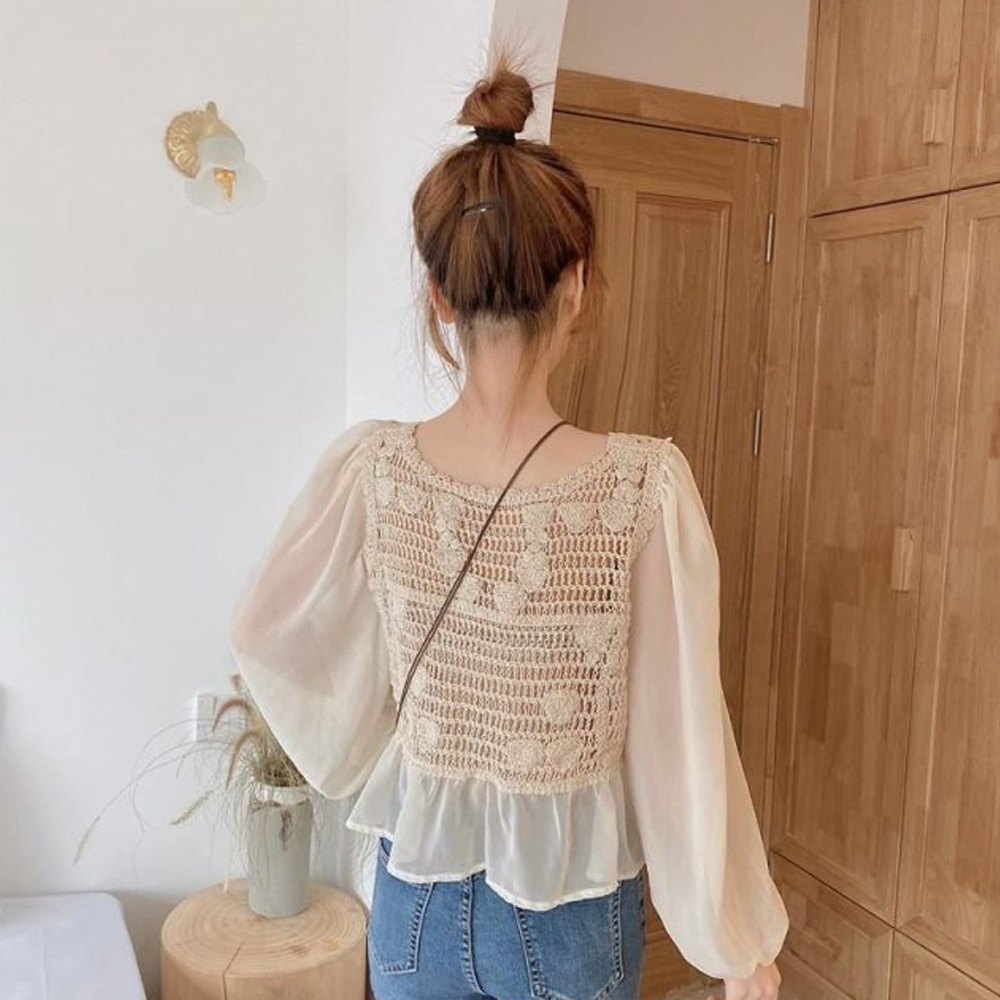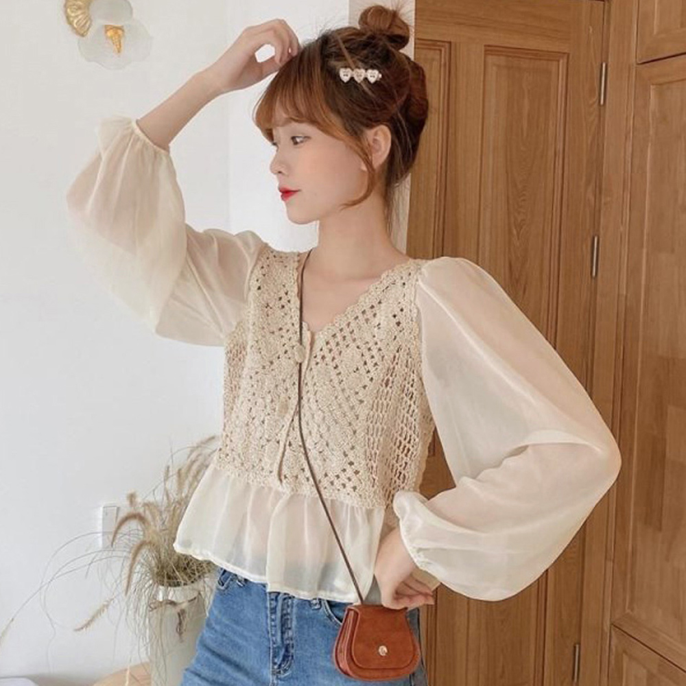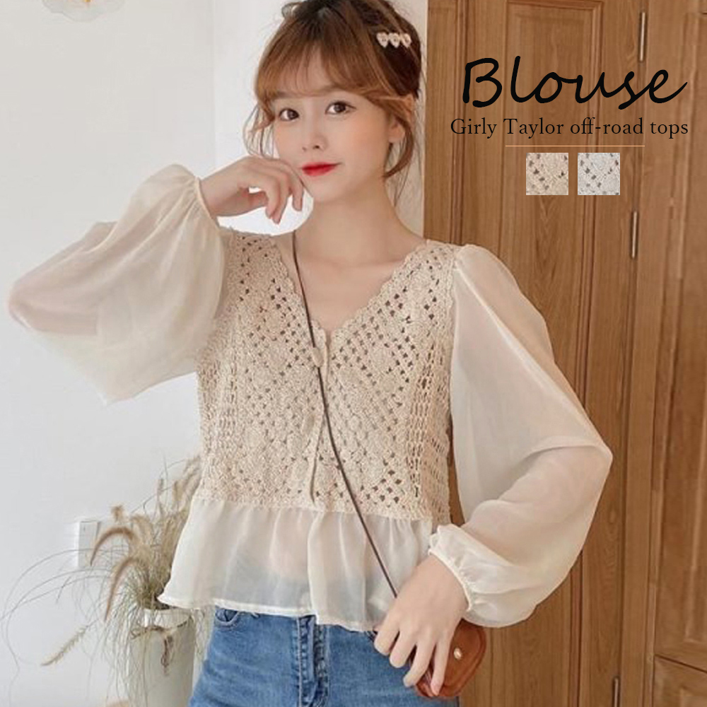 袖と身頃の異素材切替がエレガントなかぎ編みブラウストップス。