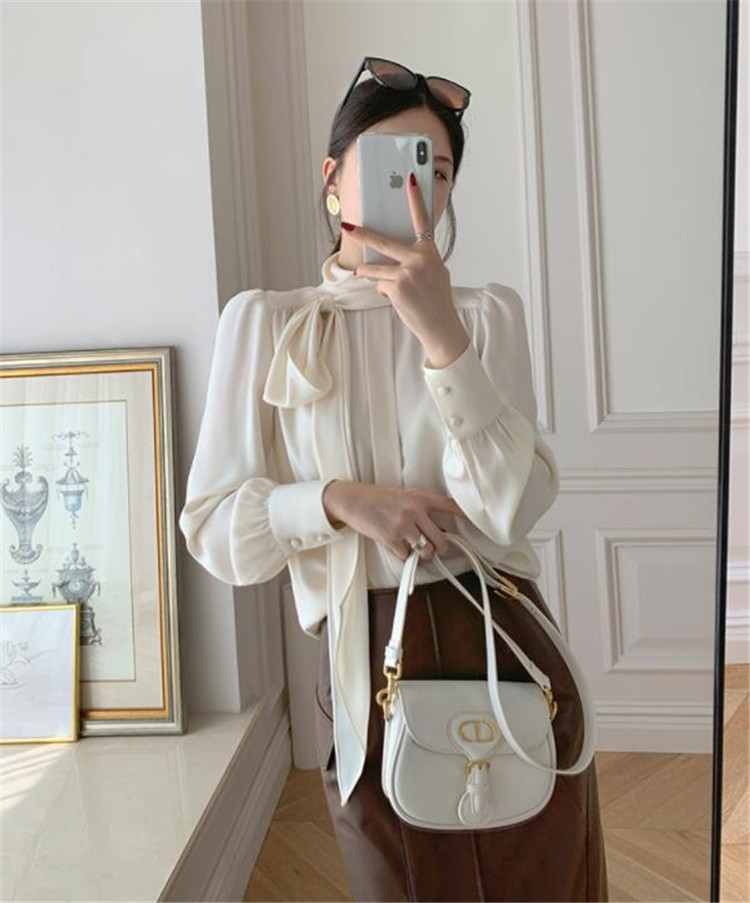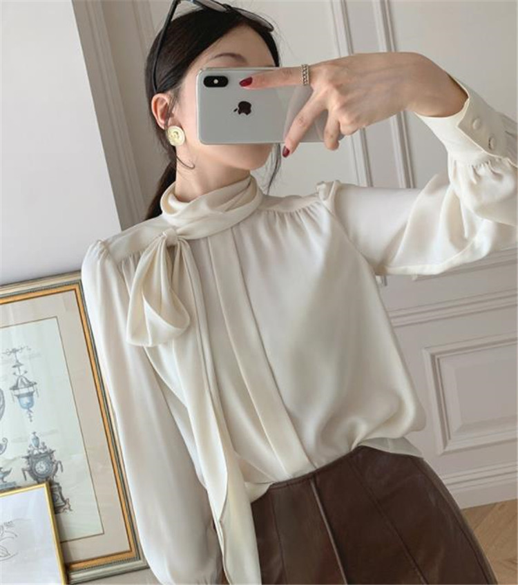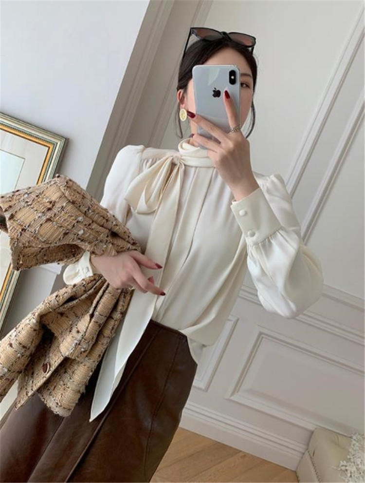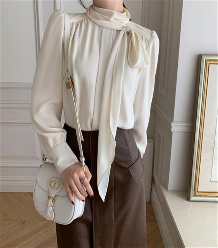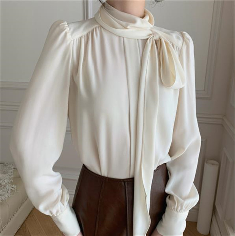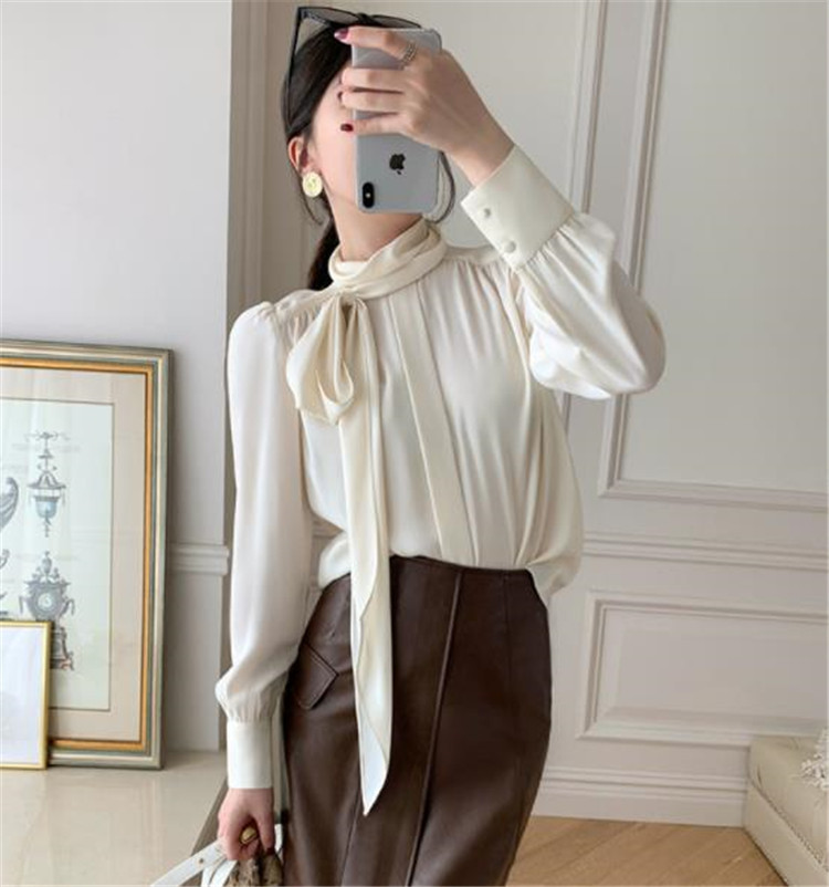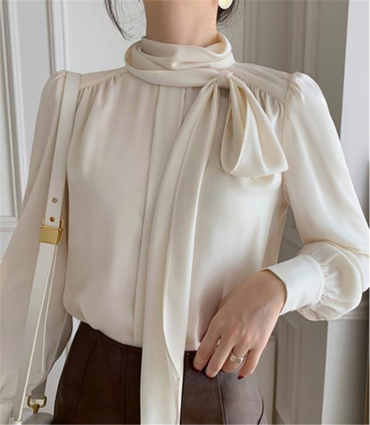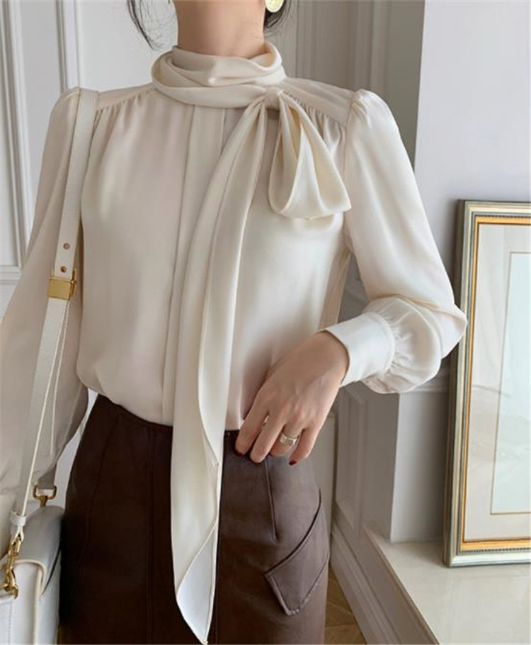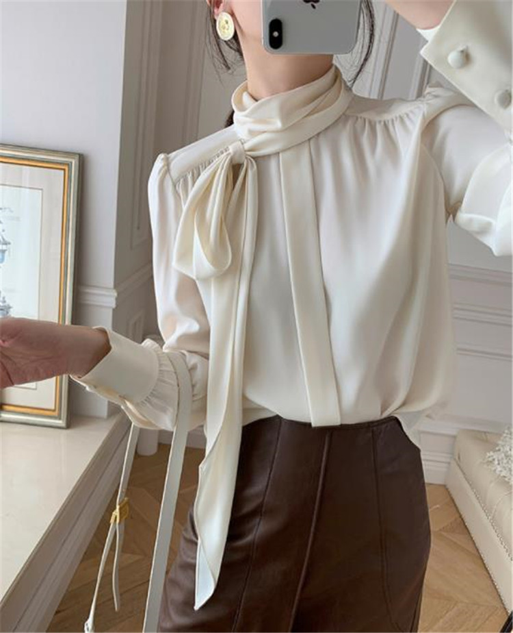 上品なボウタイデザインが印象的な女性用長袖ブラウストップスです。