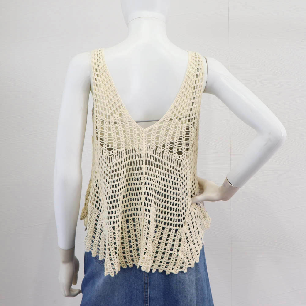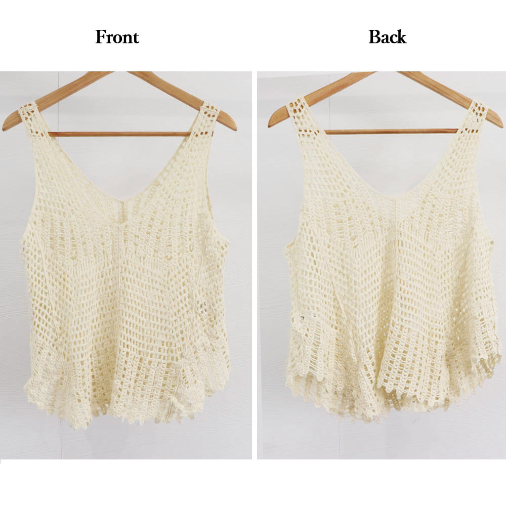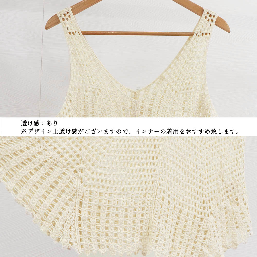 素材:ポリエステル75%+アクリル25%。カラー:ベージュ/ホワイト。サイズ:ワンサイズ。着丈:約60cm、身幅:約52cm、胸囲:約104cm。裏地:なし。伸縮性:なし。透け感:あり。デザイン上透け感がございますので、インナーの着用をおすすめ致します。すべて平置きサイズです(採寸方法違いより、多少の誤差がございますので、ご了承ください)。商品の細部仕様は多少異なる場合がございます。