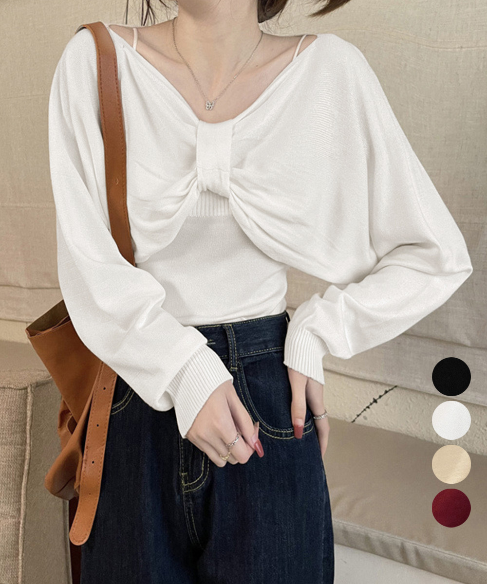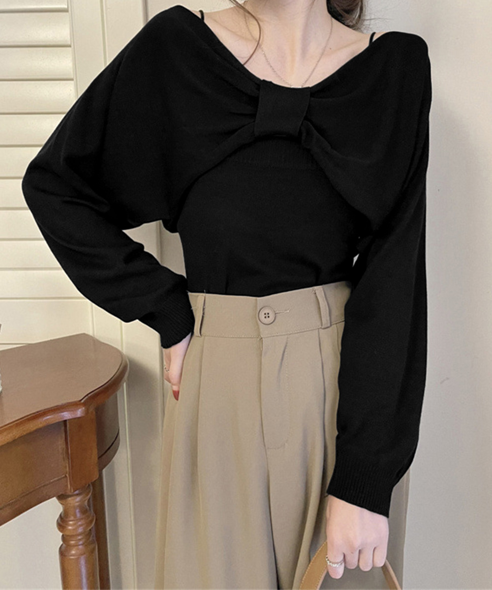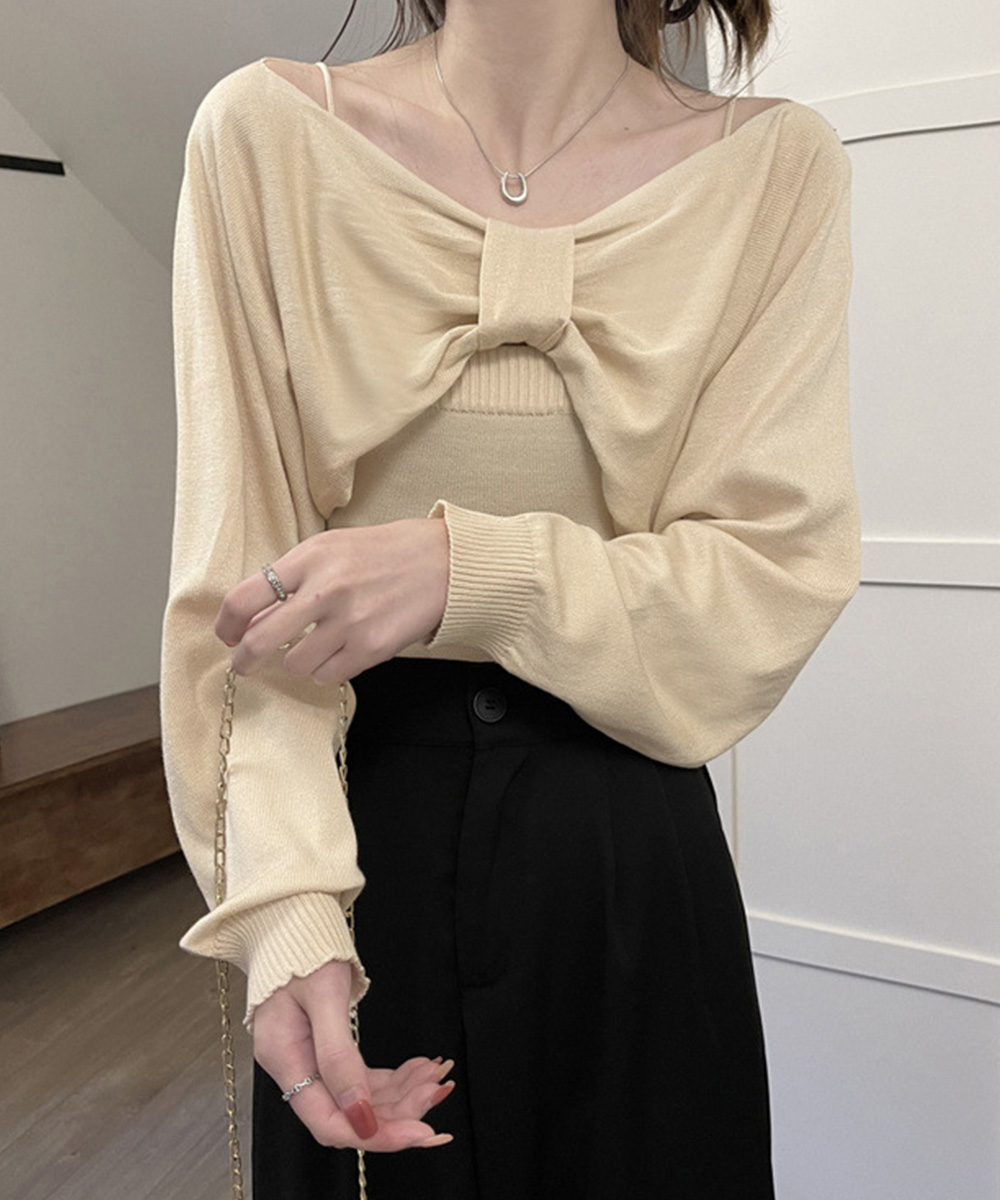 胸元の立体的なリボンが印象的なニットトップスとキャミソールの二点組です。