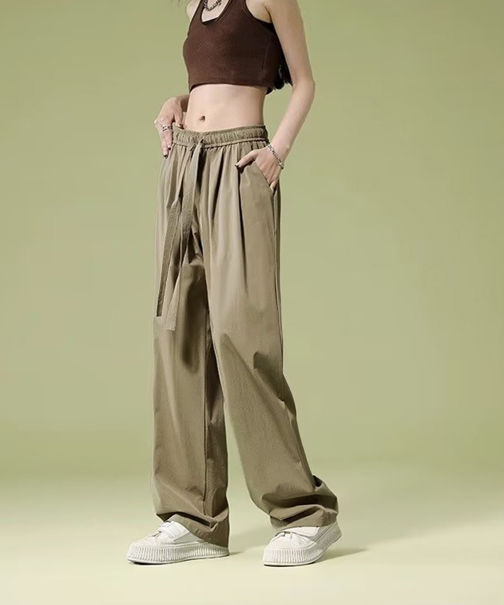 ウエストゴム仕様で紐調節も可能、ストレスフリーなはき心地を実現。