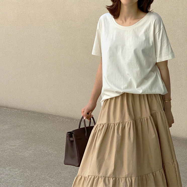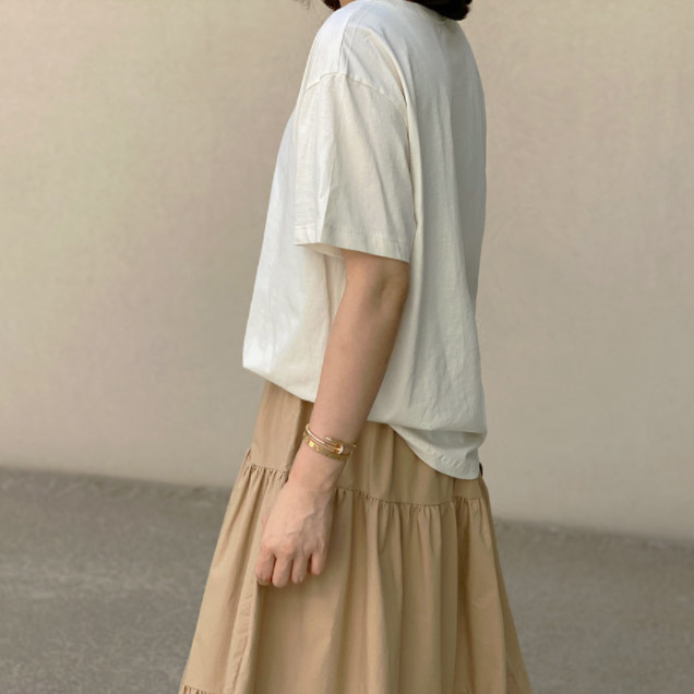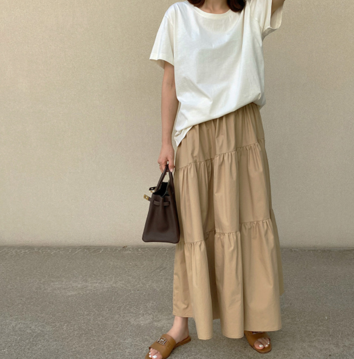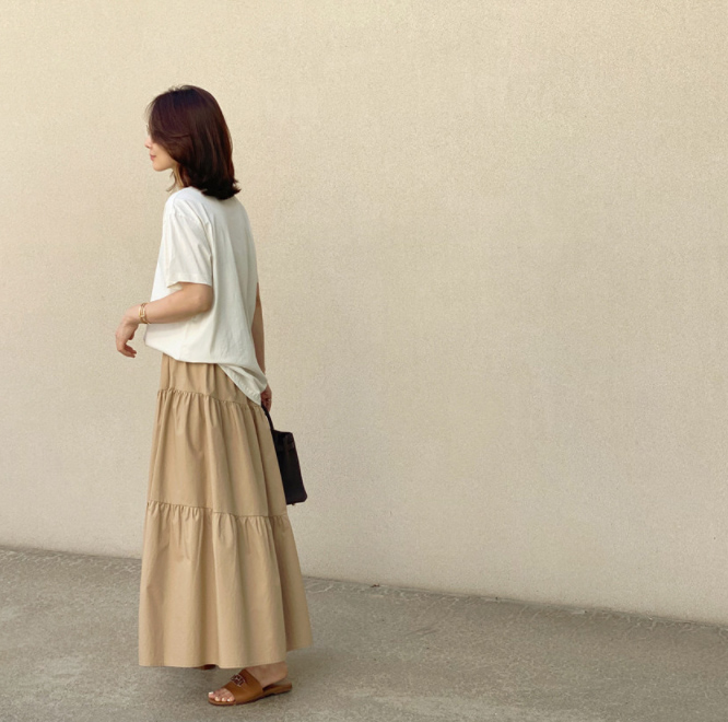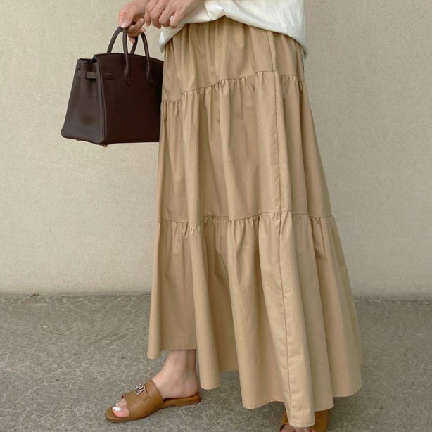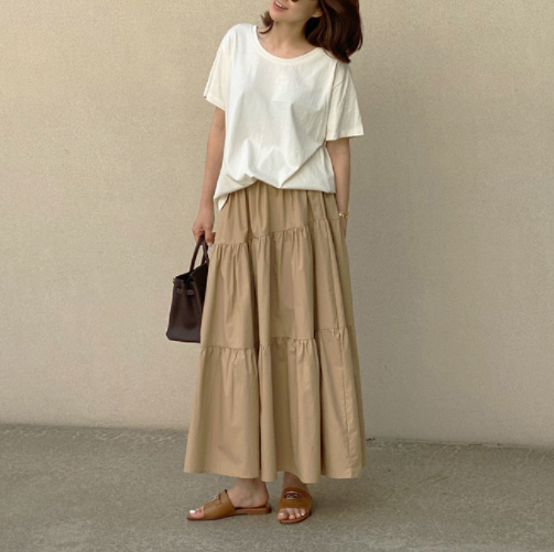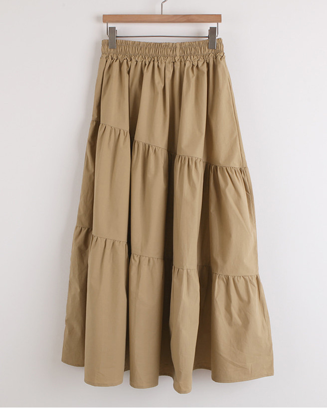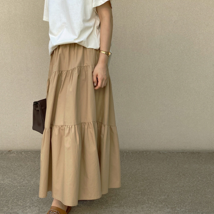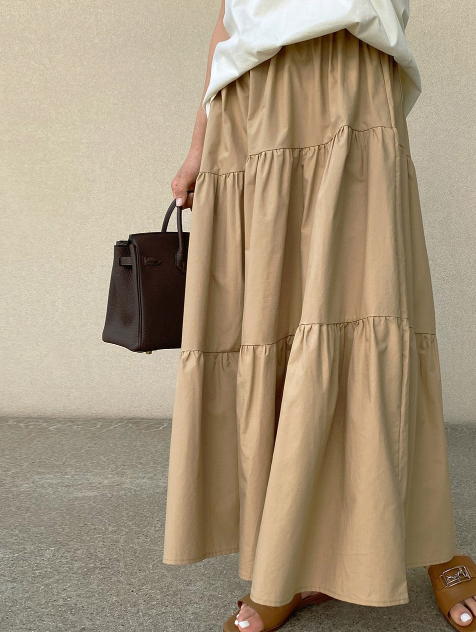 ベージュコーデにぴったりな上品なティアードロングスカートです。