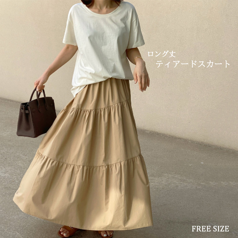 ■コメント ◇ポイント◇ ・ふわっと上品に広がる3段切替ティアードスカート。 ・程よいボリューム感が大人かわいい印象。 ・ウエストゴムで楽ちん。 ・脚カバーできるロング丈。 ・プリーツが縦ラインを強調し、脚長効果あり。 ◇スタイリング◇ ・カジュアルにもキレイめにも対応できるスカート。 ・トップスをインすればスッキリとした着こなしができます。 ・シンプルデザインなのでどんなトップスにも合います。 ・日常、通勤通学はもちろんデート、特別な日にもおすすめです。 ■サイズ(単位:約cm) FREE:ウエスト(ゴム)30cm 、総丈87cm 平置き採寸のため誤差あり ※お手持ちのものと、サイズを比較したうえでのご注文がおすすめです ■カラー ベージュ ■伸縮性 なし ■裏地 なし ■生地の厚さ 普通 ■透け感 なし ■素材 綿80%、ポリエステル20% ■重量 350g ■包装状況 OPP袋