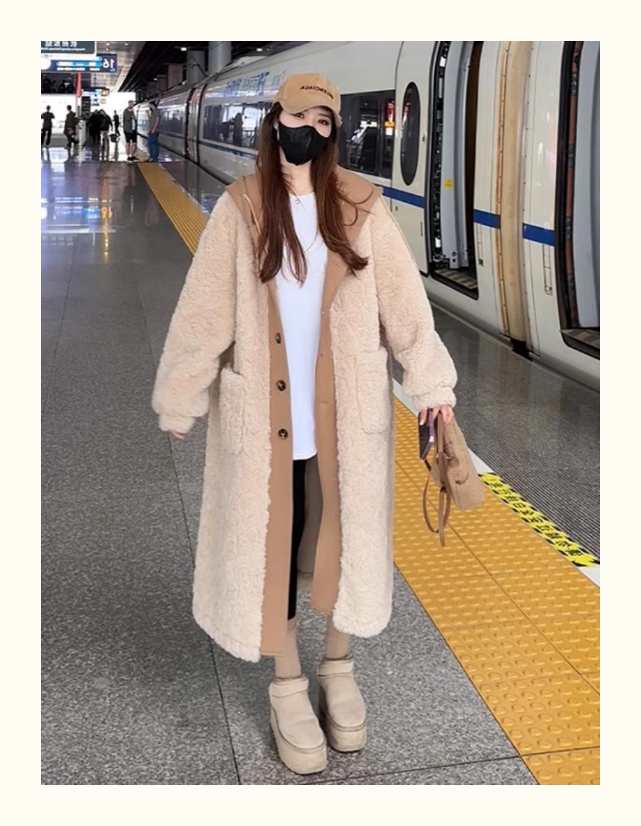ベージュコーデの定番アイテムとなるコートです。ふんわりとした質感のフェイクファーを贅沢に使用し、暖かみのある雰囲気を演出。
